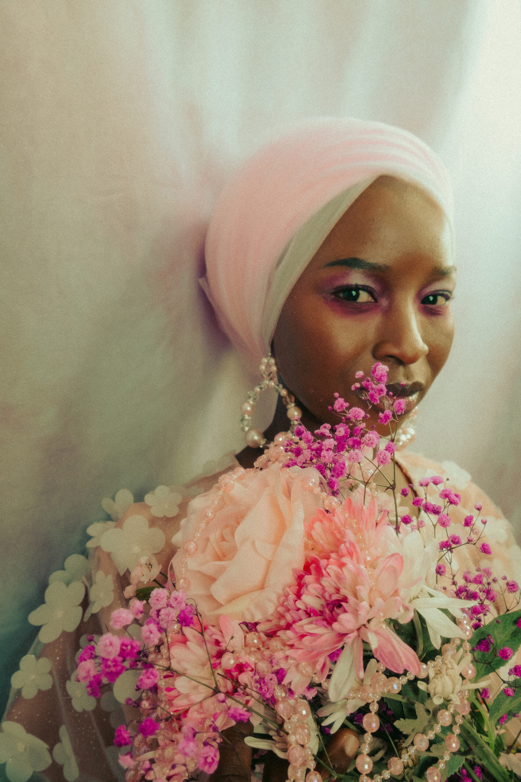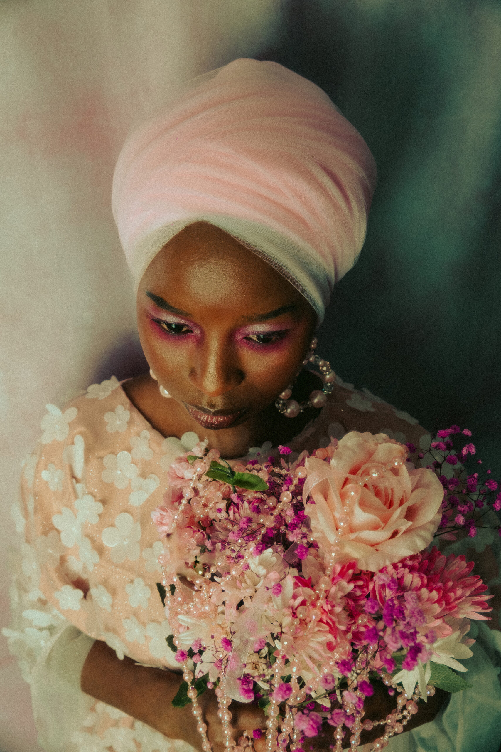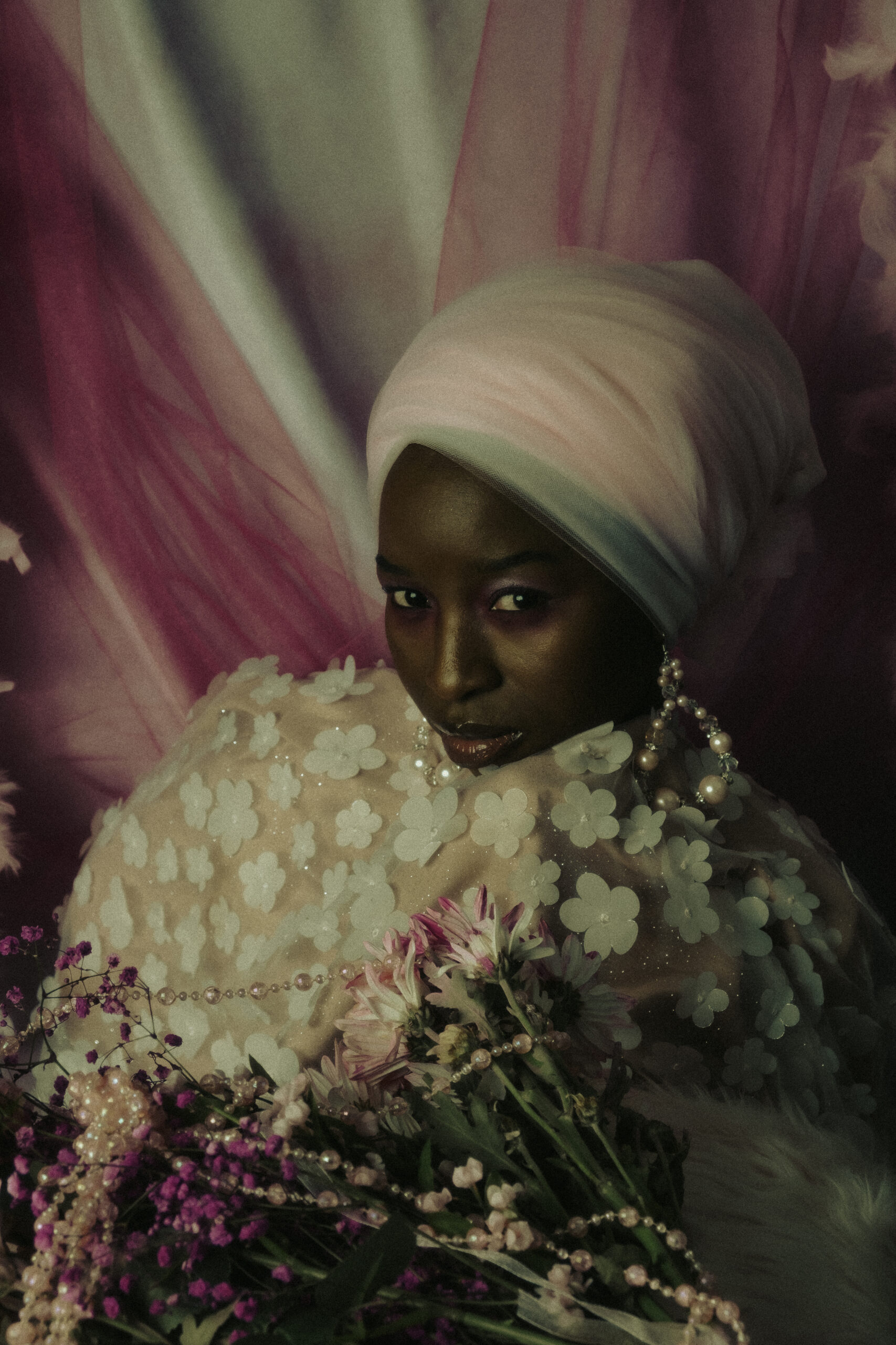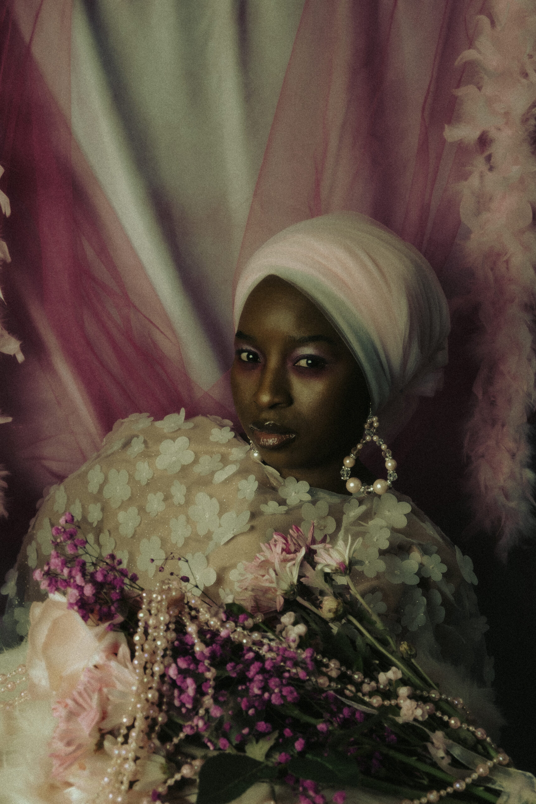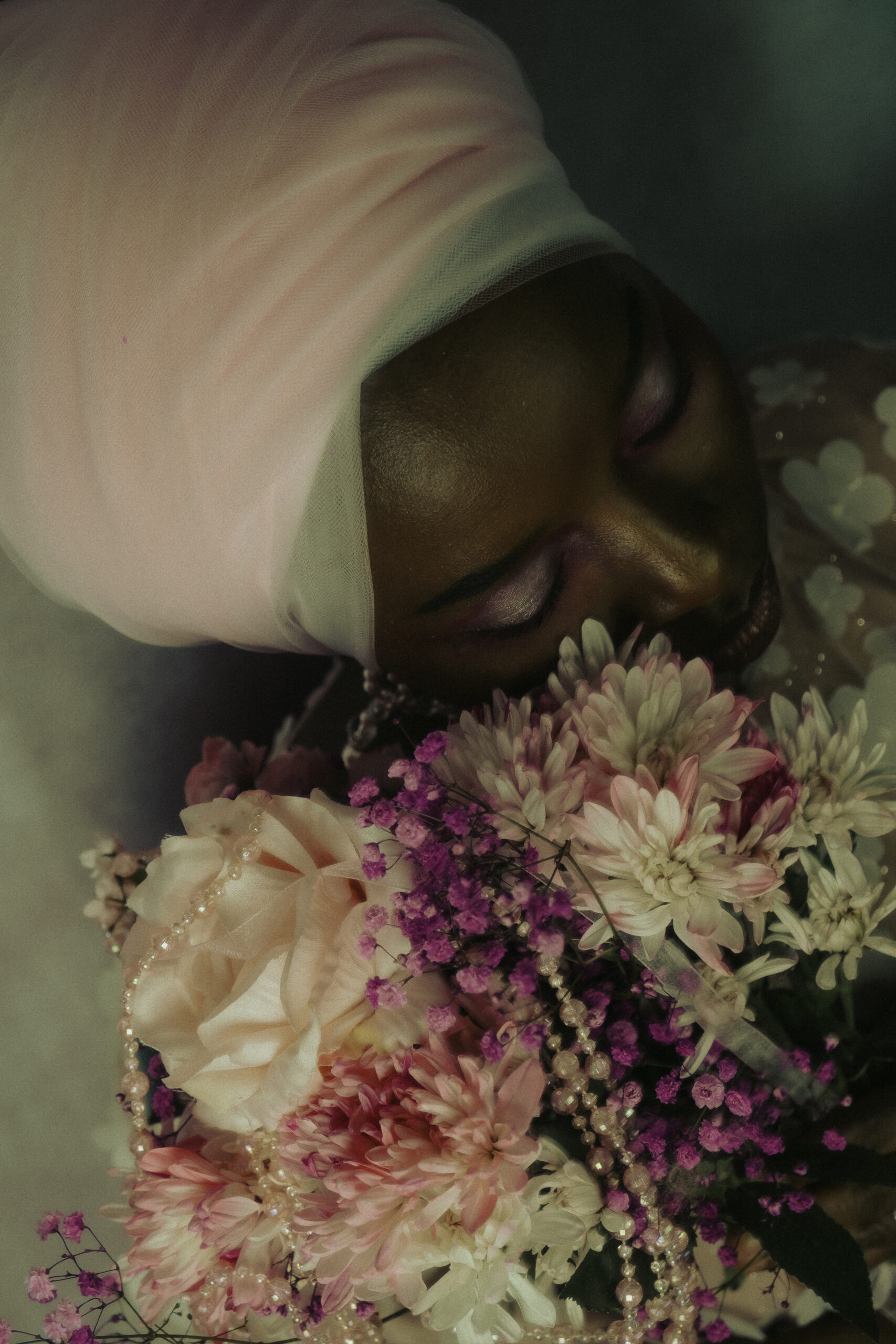 In this photographic project, pink florals rest within layers of delicate pink mesh, adorned with soft pink flowers and luminous pink beads—each element chosen to embody tenderness, devotion, and sacred beauty. The mesh acts as a veil, symbolizing the thin boundary between the physical and the spiritual, inviting the viewer to look beyond what is seen and sense what is felt.